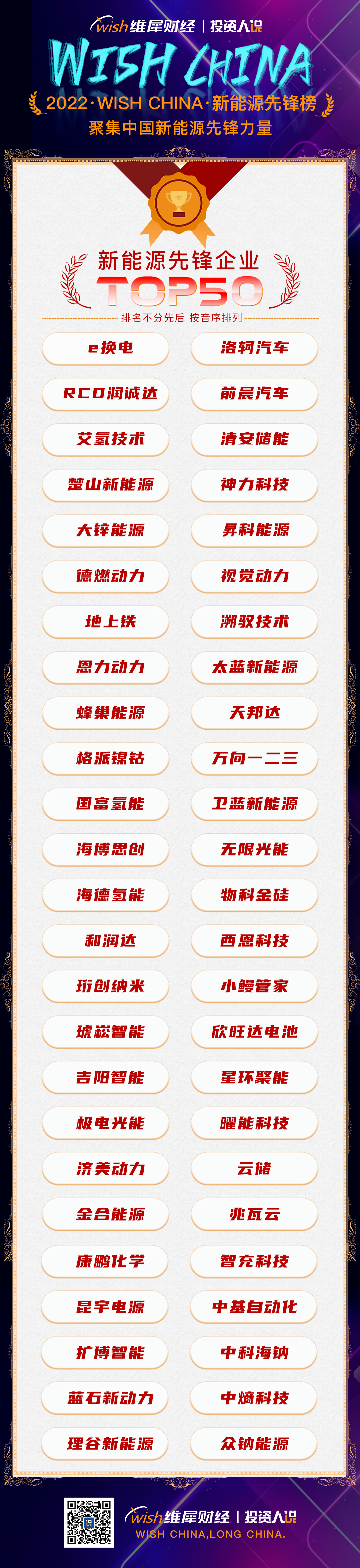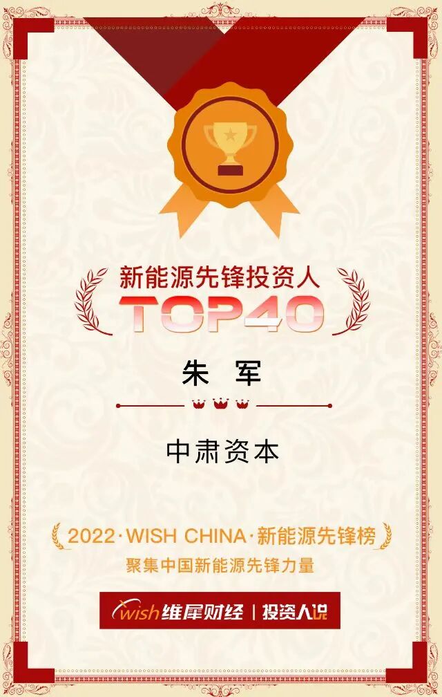中肃资本及投资企业德燃动力双双入选「WISH CHINA」2022新能源先锋榜单,并荣登三项2022新能源先锋榜单,其中中肃资本入选「WISH CHINA」2022 新能源先锋投资机构,中肃资本董事长朱军入选「WISH CHINA」2022 新能源先锋投资人,中肃资本投资企业德燃动力入选「WISH CHINA」2022 新能源先锋企业。